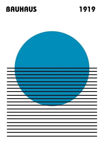 En poster med motiv inspirerat av Bauhaus-rörelsen och årtalet 1919. Postern har en blå cirkel och horisontella svarta linjer.