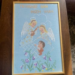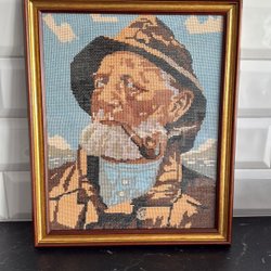 En vacker broderad tavla med motiv av en man i ett träd och en hund nedanför. Tavlan är detaljrik och har fina färger.