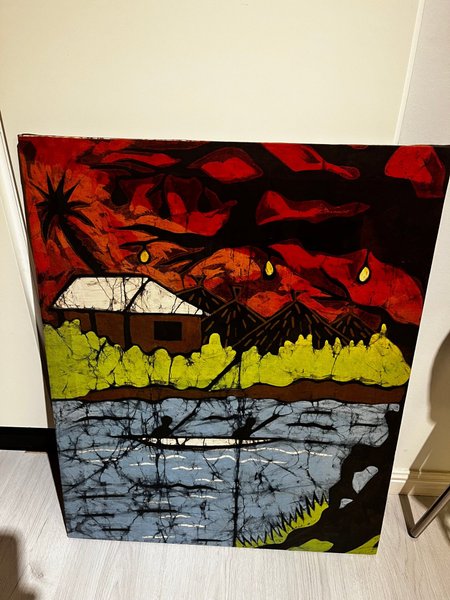 En färgglad målning med motiv av hus, vatten och himmel i rött, blått och grönt. Gjord i batik. storlek 78x62 cm