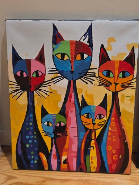 Farverigt maleri med et motiv af katte. Maleriet er perfekt til at lyse ethvert rum op med sine livlige farver og unikke stil.