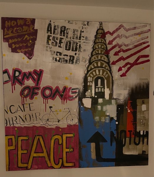 En stor fin färgglad tavla med motiv av byggnad, text och pilar i nyskick. MVH