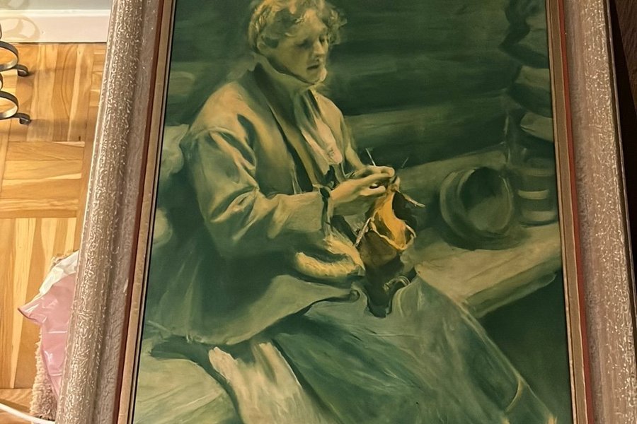 En vacker tavla som föreställer en kvinna som stickar.