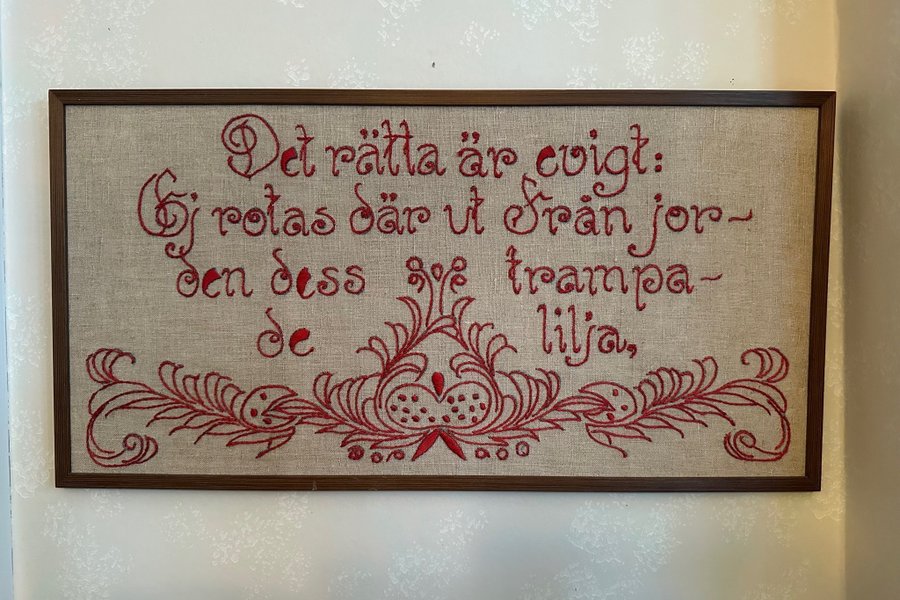 Broderad tavla med texten ”Det rätta är evigt: Ej rotas där ut från jorden dess trampade lilja,”.