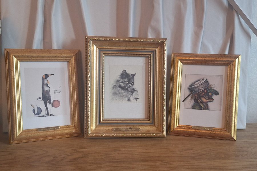 Tre tavlor med motiv av Lasse Åberg. Motiven inkluderar en pingvin, en katt och en figur med hatt.