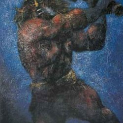 En tavla med motiv av en samuraj och en tiger under en fullmåne. Körsbärsblommor syns i bakgrunden.