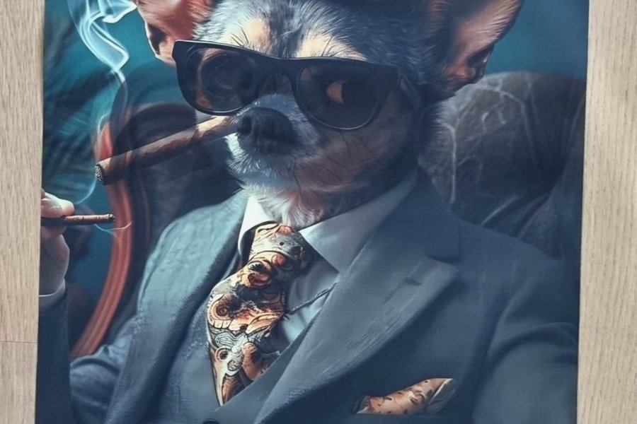 Stilfull tavla med ett motiv av en hund i en kostym med hatt och solglasögon, rökandes en cigarr. Utan ram. Fin att fästa upp med det man önskar som den är eller ramas in. Mått 37,5 cm höjd , 30 cm bredd. Bra canvas kvalitet.