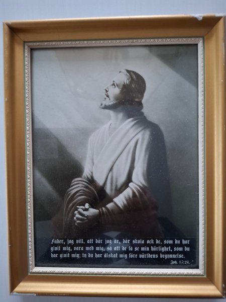 En tavla med texten 'Fader, jag vill, att där jag är, där skola ock de, som du har givit mig, vara med mig, så att de få se min härlighet, som du har givit mig; ty du har älskat mig före världens begynnelse. Joh. 17:24.'