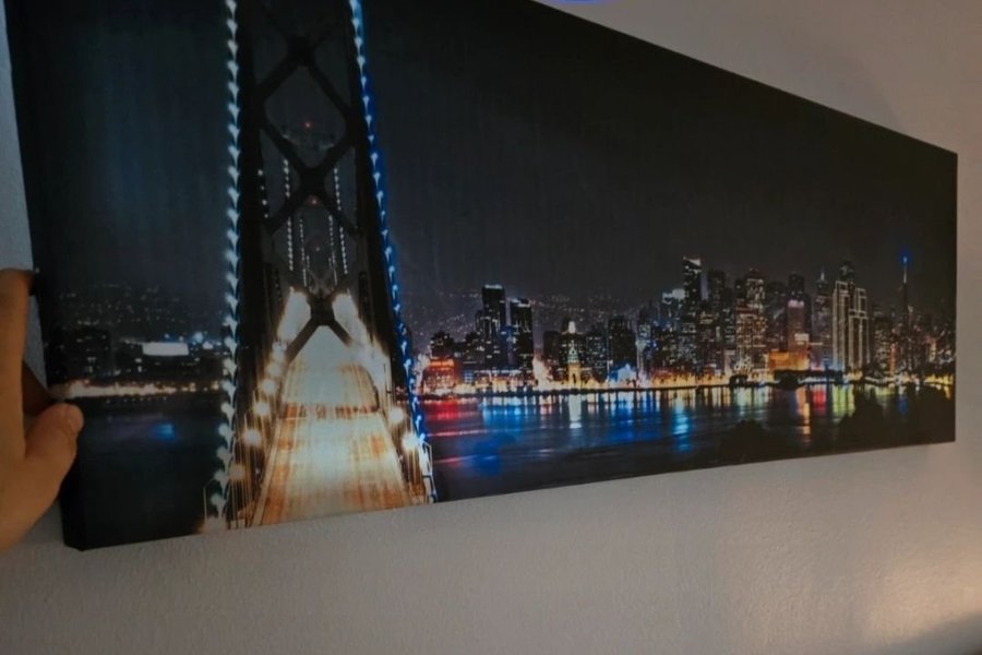 En led tavla med motiv av en bro och en stad i bakgrunden. Perfekt för att ge rummet en modern känsla,köpte från Trademax för 799kr,batteri ingår inte