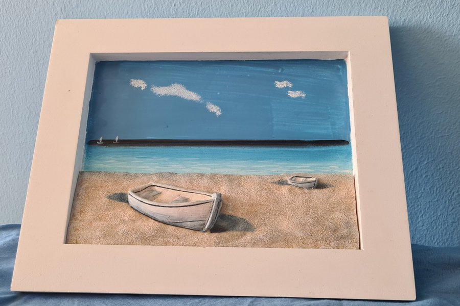 En tavla med motiv av strand och båtar som har höjden 20 cm och längden 25 cm.