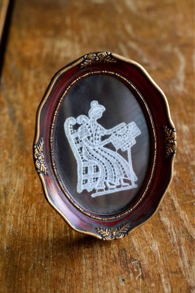 En liten tavla med ett vackert spetsmotiv. Tillverkad i Bryssel, troligtvis under 1970-talet.