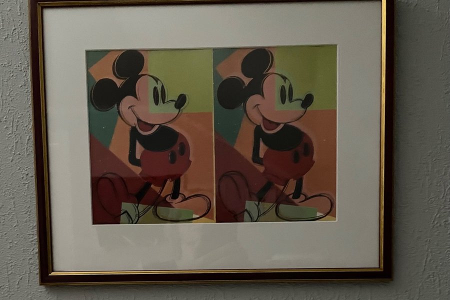 Tavla med motiv av Musse Pigg i popkonststil. Färgerna är ljusa och motivet är upprepat två gånger. 38x31cm