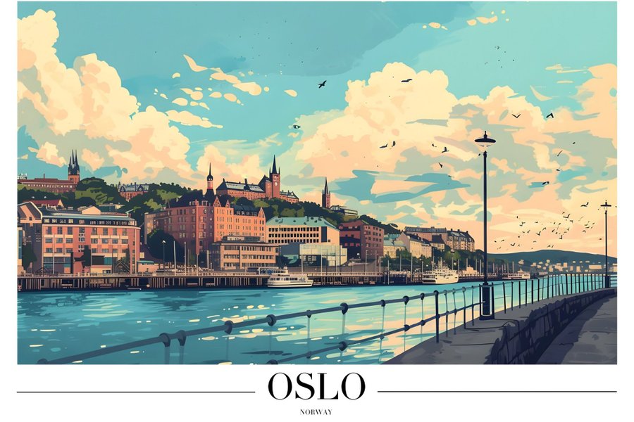 Affisch med motiv av Oslo, Norge. Bilden visar en stadsvy med byggnader längs vattnet under en himmel med moln och fåglar.
