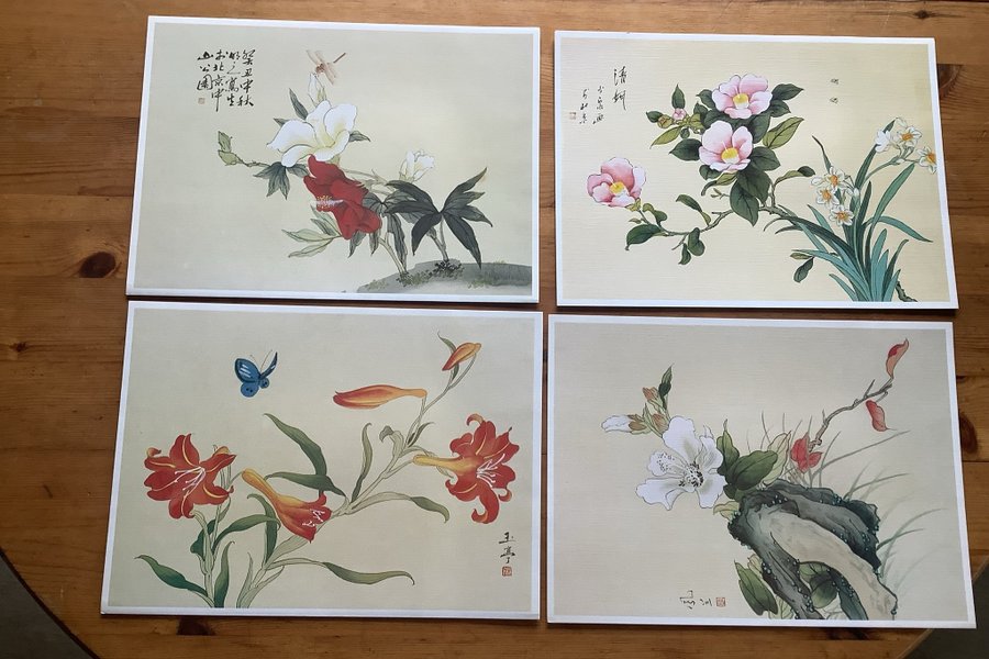 Dessa tavlor har blommiga motiv. De är i en orientalisk stil och har text i det övre vänstra hörnet.