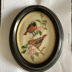 Äldre broderad tavla med hundmotiv. Lite skav på ramen enligt bild. Mått 45*35 cm.