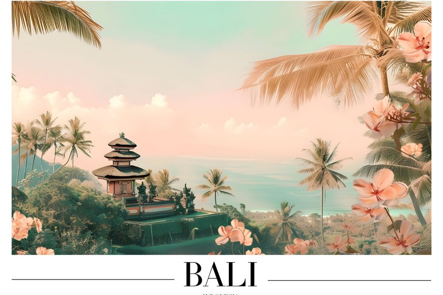 En poster med ett motiv från Bali, Indonesien. Bilden visar ett tempel omgivet av palmer och blommor, med havet i bakgrunden. Färgerna är i mjuka pastelltoner.