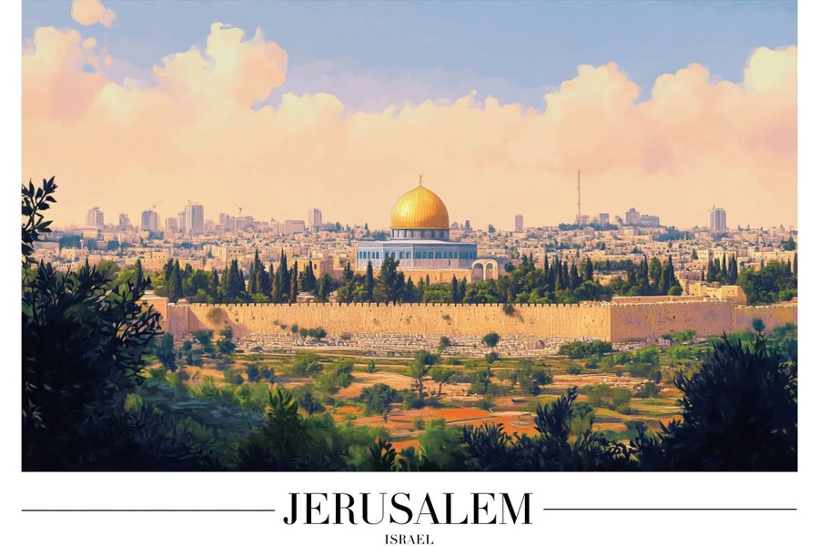 Affisch med motiv av Jerusalem, Israel. Bilden visar stadens silhuett med den gyllene kupolen i förgrunden och en mur nedanför. Grönska ramar in den nedre delen av bilden. Texten "JERUSALEM" och "ISRAEL" finns längst ner på affischen.