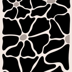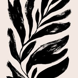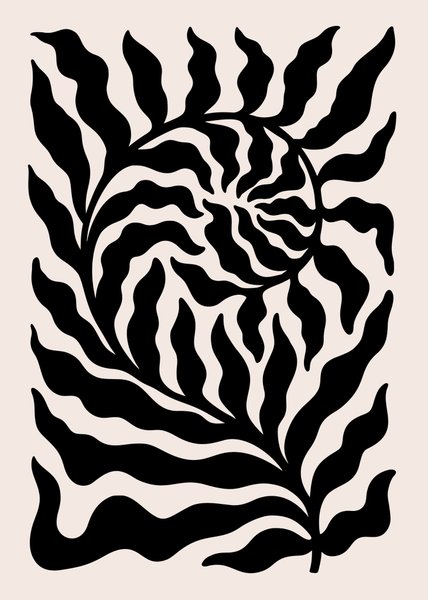 Svartvit abstrakt bladkonst. Bladen är stiliserade med vågiga former som strålar ut från en central punkt. Färgerna är kontrasterande svart och beige.