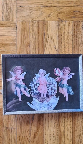 En charmig tavla med änglamotiv. Den har en silverfärgad äldre ram. Går att ställa på bord eller hänga. Ramens yttermått ca 18x13 cm.