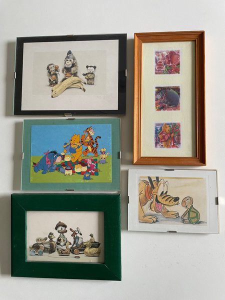 Fem tavlor med Disney-motiv. En tavla med Musse Pigg och ankor, en tavla med Nalle Puh och hans vänner, en tavla med Pluto och en sköldpadda, samt en tavla med tre mindre bilder föreställande Nalle Puh, Nasse och Ior. En tavla med apor.