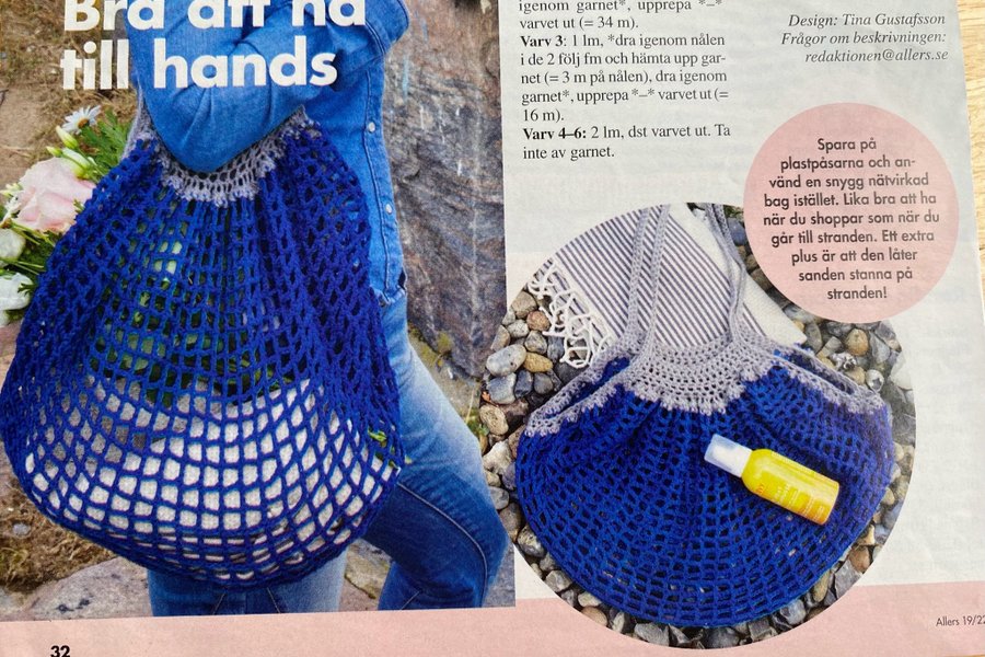 Mönster för att virka en bag. Tidningsurklipp. Storlek ca 45 x 40 cm exkl. handtag. Betalning sker inom5 dagar efter avslutad auktion. Köparen står för frakt .