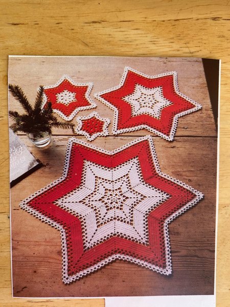 Mönster för att virka stjärndukar. Tidningsurklipp. Storlek ca 15, 26, 42, 58 cm från udd till udd . Betalning sker inom5 dagar efter avslutad auktion. Köparen står för frakt.
