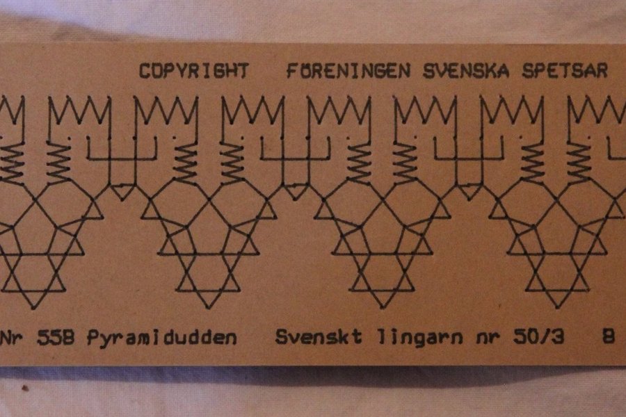 Mönster från Föreningen Svenska Spetsar, nummer 558 "Pyramidudden". längd 4,1 cm bred 8 par nr 50/3 svenskt lingarn. Arbetsbeskrivning finns