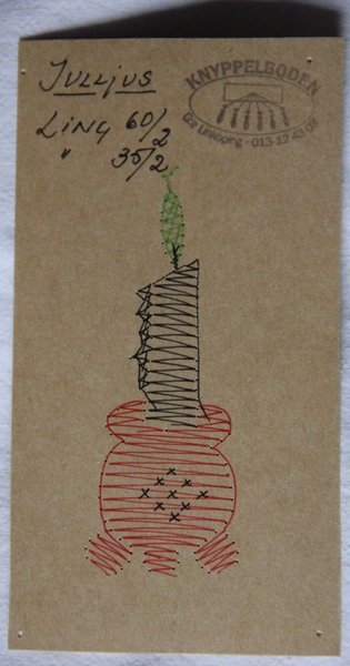 Julljus 2011 motiv 9,5 x 3,5 cm 12 par nr 60/2 vitt lingarn samt flera färger lingarn Beskrivning