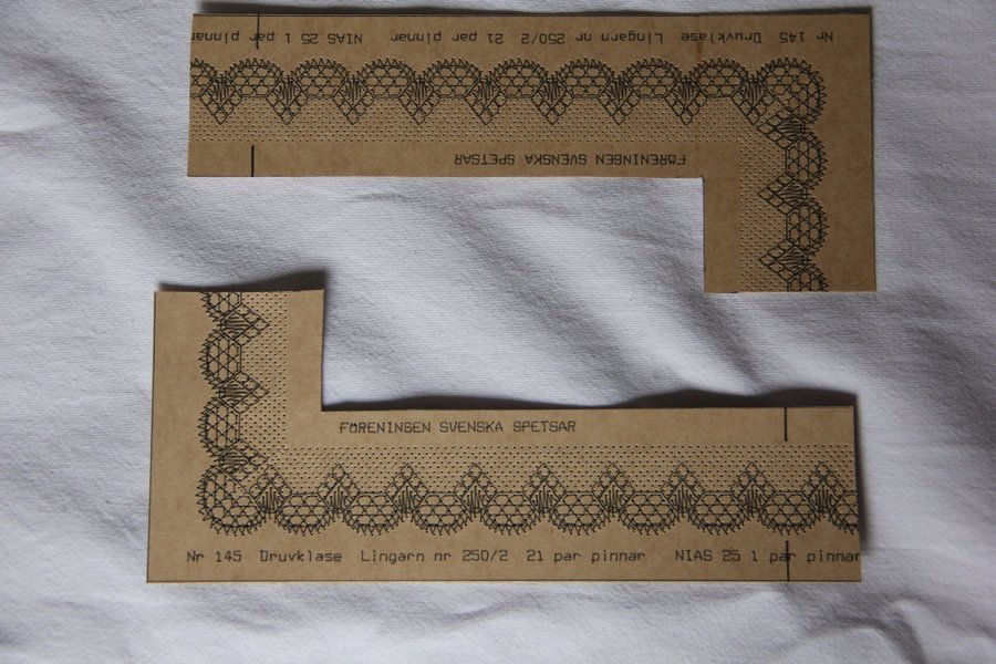 Druvklase 145 näsduk 2,2 cm bred 21 par nr 250/2 lingarn + 1 par NIAS 25 alternativ finns angivet Arbetsritning finns