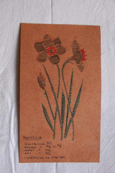 Pingstlilja motiv 21 x 11 cm nr 35/2 lingarn samt flera färger lingarn Arbetsritning finns