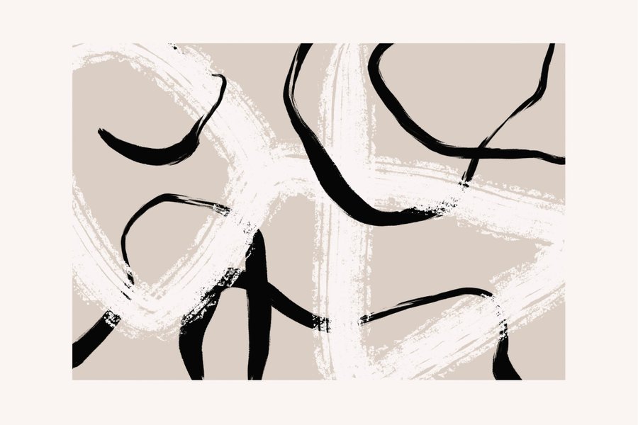 Abstrakt tavla med beige bakgrund och svarta samt vita penseldrag.
