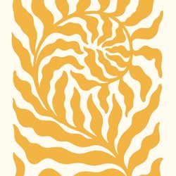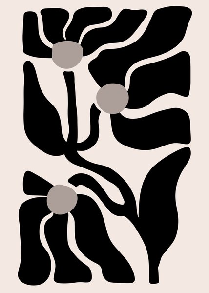 Poster med ett abstrakt blommigt motiv i svart och beige. Motivet föreställer stiliserade blommor med runda centra och böljande kronblad och blad.