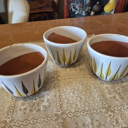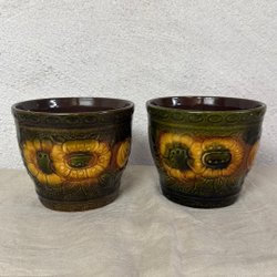 Två retro ytterkrukor i brunt och vitt.