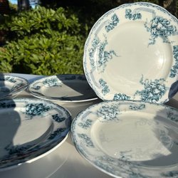 En söt, ganska stor kruka med reliefdekor av blommor och sirligt mönster med prickar. Gräddvit / antikvit botten med ljusgröna handmålade ränder. Den är troligtvis från 1990-2000-tal dvs inte så gammal, men i äldre stil.