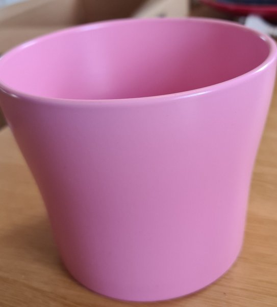 En rosa blomkruka i matt glasyr. 12 cm hög, ca 10 cm i diameter invändigt i nederkant. 14 cm i överkant.