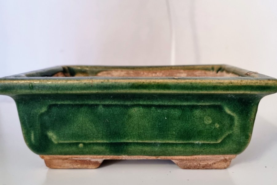 Grön bonsai kruka med dekorativ design. Perfekt för att odla bonsai träd. Krukan har ett avrinningshål. 14 x 9 cm. Djup ca 4 cm.
