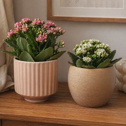 Två blomkrukor. En beige och en med svartvita ränder. 14 höga och 12 cm innermått