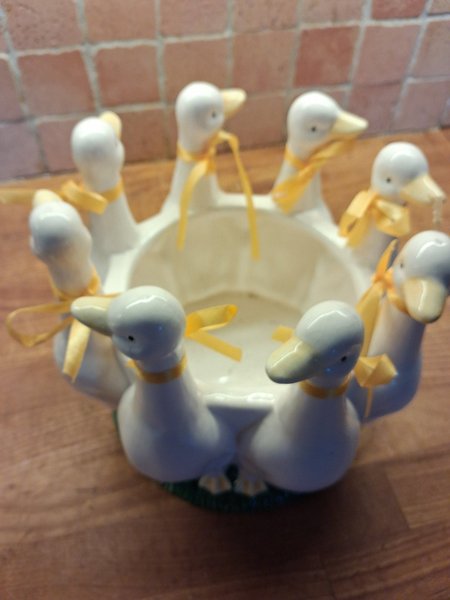 Blomkruka formad som ankor med gula band runt halsen. Krukan är vit med gula näbbar och svarta ögon.