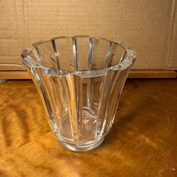 Två glasburkar. En burk har ett mönster av rutor och den andra har vertikala ränder med ett vågigt mönster upptill. Den rutiga burken är 14 cm hög och har en diameter på 12 cm. Den randiga burken är 12 cm hög och har en diameter på 11 cm.