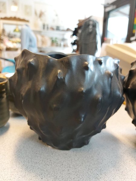 1st svart kruka med en unik textur som liknar taggar eller knottror. Krukan har en matt yta och en oregelbunden form, vilket ger dem ett distinkt utseende.