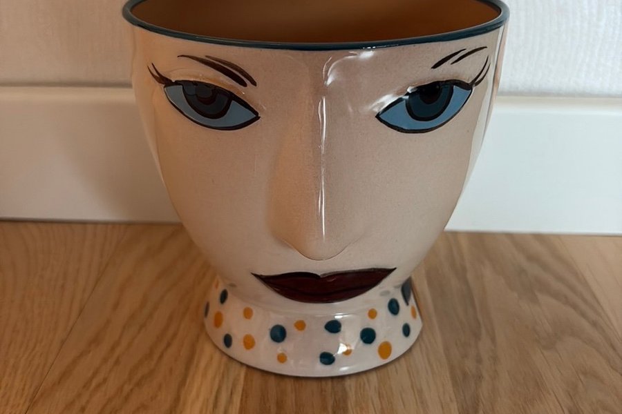 Kruka formad som ett ansikte med blå ögon och röda läppar. Halsen har ett mönster av gula och blå prickar.