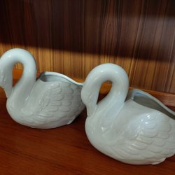 Två krukor, en brun keramik kruka och en keramik sko.