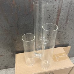 Tre glasvaser i olika modeller. Den smalaste 31 cm hög 3 cm diameter en liten flisa i toppen, den mellersta 31 cm hög 4 cm i diameter en liten flisa i toppen, den breda 23 cm hög 10x6 cm öppning, lite kantstött längst upp.