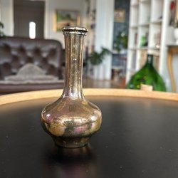 En vas, kan vara en cloisonne vas, med blommönster. Metall, men hittar inga stämplar. Har ärvt den så vet inte mycket om den. Den har en liten buckla, se sista 2 bilderna. Är även lite defekt I färgen i bucklan.