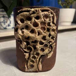 Färger: Brun, orange och vit glasyr.