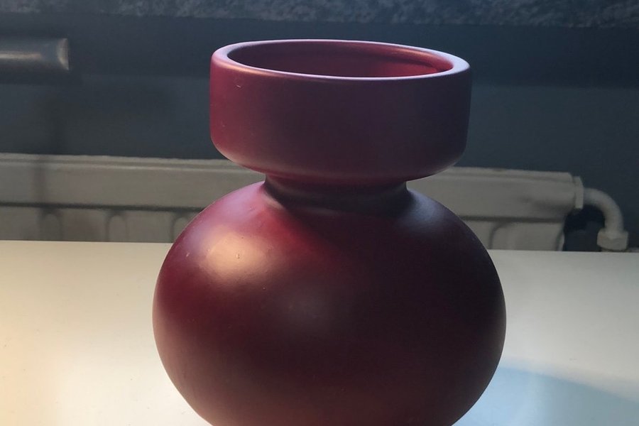 En röd vas med en rundad bas och en smalare hals som vidgas upptill.