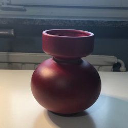 Gul vas i keramik. Vasen har en rund form med en smal öppning upptill. Färgen är matt gul.