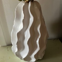 Rund vit vas i porslin. 23 cm bred och 23 cm hög. Blommorna sätts in på sidan. Troligtvis 90-tal.
