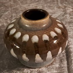 Stilren keramikvas i en jordnära färgskala. Vasen har en texturerad yta med vertikala ränder upptill och en slät, ljusare bas. Ca 20cm hög. Mycket fint skick!