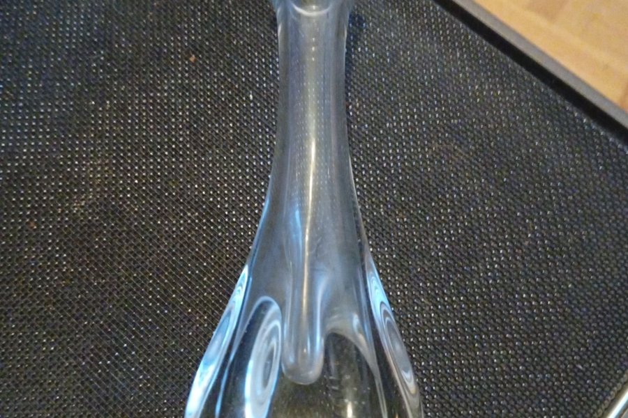 En elegant glasvas med en unik form, perfekt för att visa upp dina favoritblommor eller som en dekorativ inredningsdetalj.
