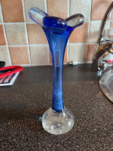 Blå vas med genomskinlig botten. Kallas för hundbensvas pga av formen! Tror det är Åseda glasbruk Bo Bergström